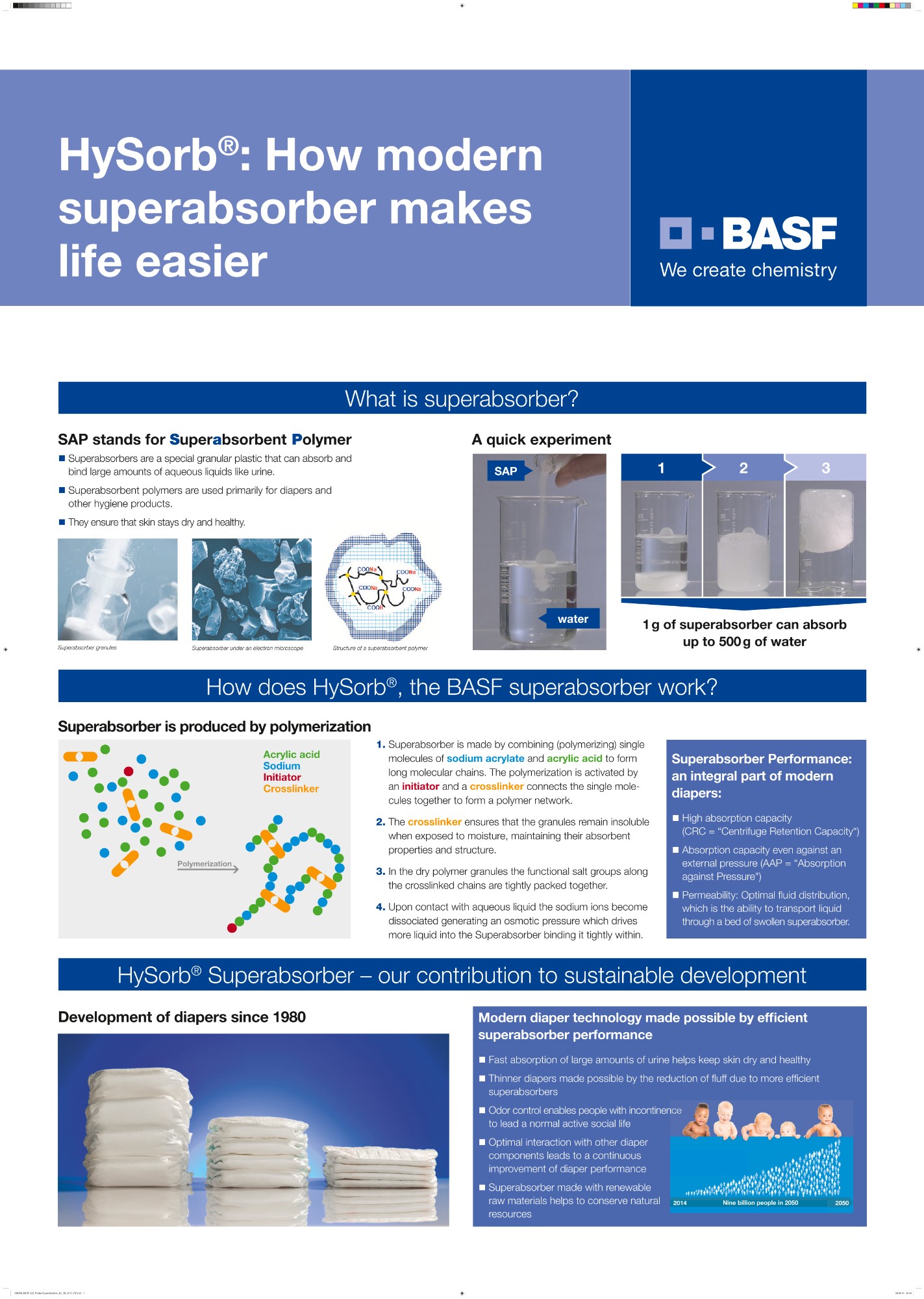 Today’s disposable diapers are high-tech products, which have become even more comfortable, thinner and absorbent over the years. A major contributing factor to this development has been innovative superabsorbents such as HySorb® and SAVIVA® from BASF.